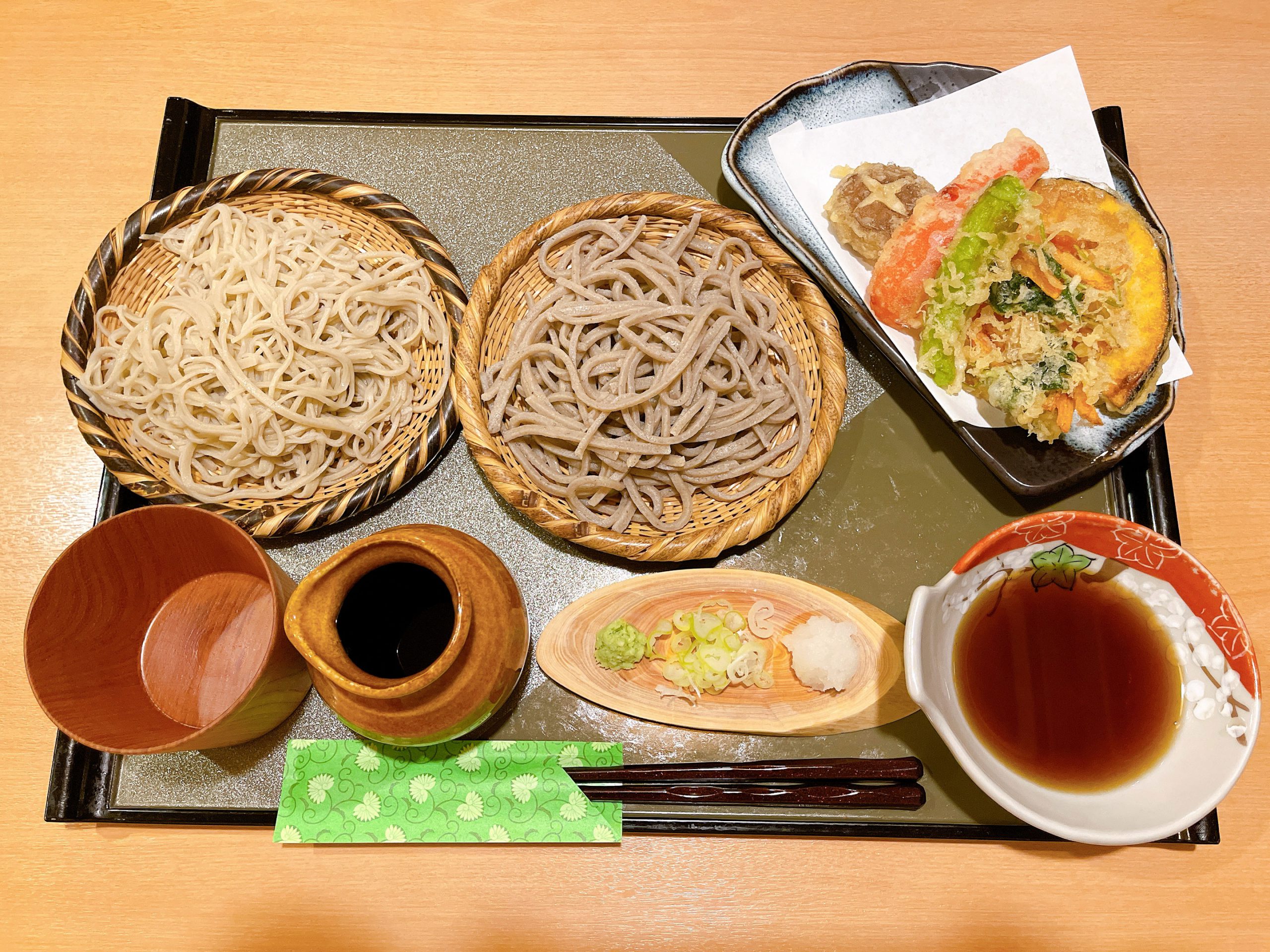 新型コロナの影響により、記載の営業時間やメニューと変更になっている場合があります。 直接店舗WEBやお電話にてご確認ください。 飲食店 2022.7.28 粋蕎庵 茂蔵 二色蕎麦 野菜天セット 1,500円(税込) もりそば(割粉0.5割)と田舎蕎麦(粗挽きのニ八蕎麦)の2種類のお蕎麦と揚げたて野菜天ぷら(5種類盛り合わせ)のセットです。